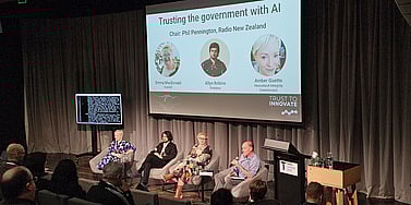 Our panellists Emma MacDonald (Stats NZ), Allyn Robins (Brainbox) and Amber Guette (Hooseland Integrity Comission) talking to RNZ journalist Phil Pennington about trusting the government with AI.